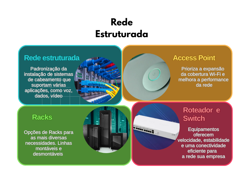 Atuamos com cabeamento estruturado, organização de racks, switches, roteadores e redes wi-fi profissionais, tudo seguindo normas técnicas e com acabamento profissional.